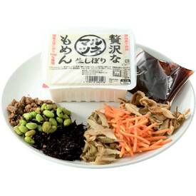 もめん豆腐、和風調味料、枝豆、ひじき、人参、椎茸、ごぼう、鶏そぼろのセットです。セット内容 もめん豆腐:400g 鶏そぼろ:30g 野菜:80g(枝豆・人参・ごぼう) ひじき:30g 椎茸:25g 和風調味料:1袋(70g) 調理時間目安約10分