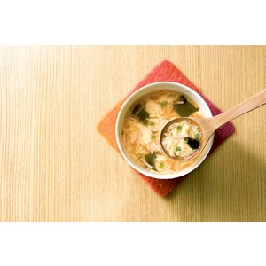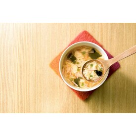 • 国産鶏卵を使用。チキンエキスとブイヨンの旨みをベースに、かに風かまぼこ、わかめ、ねぎを入れた、ふんわりとたまごが広がるスープです。